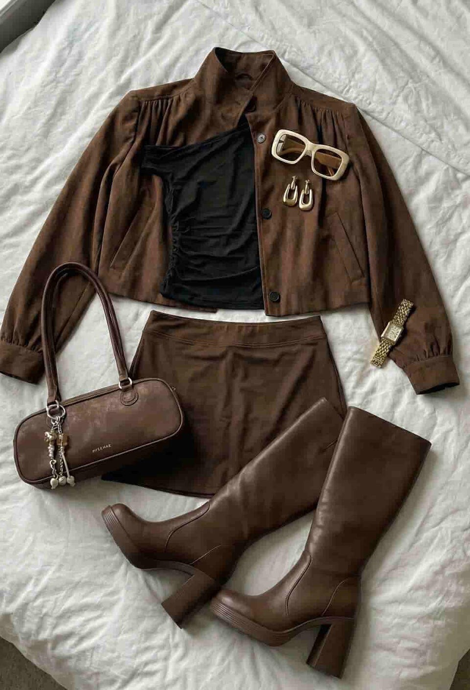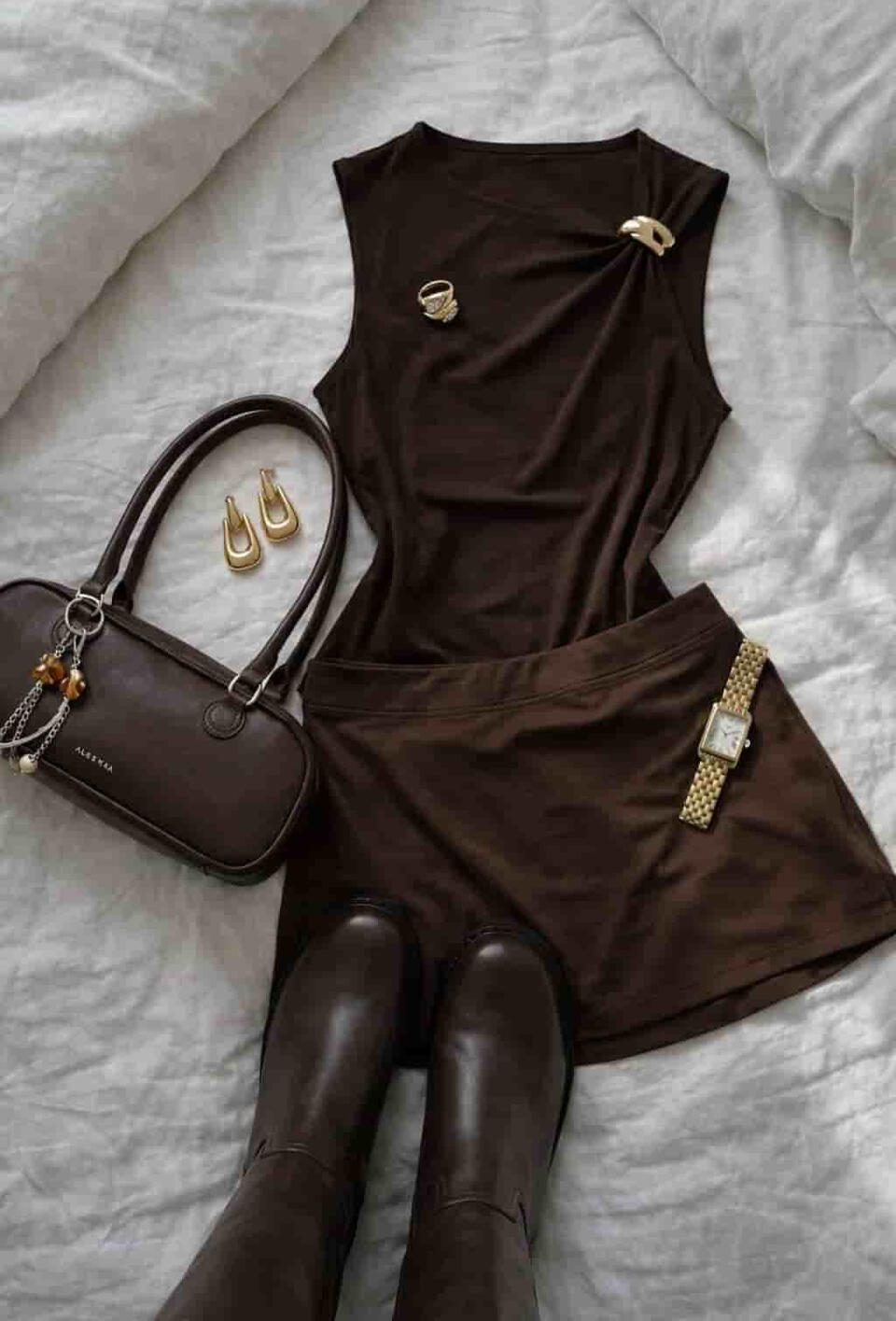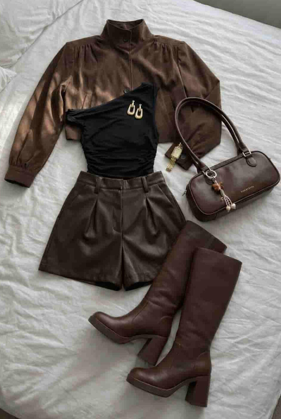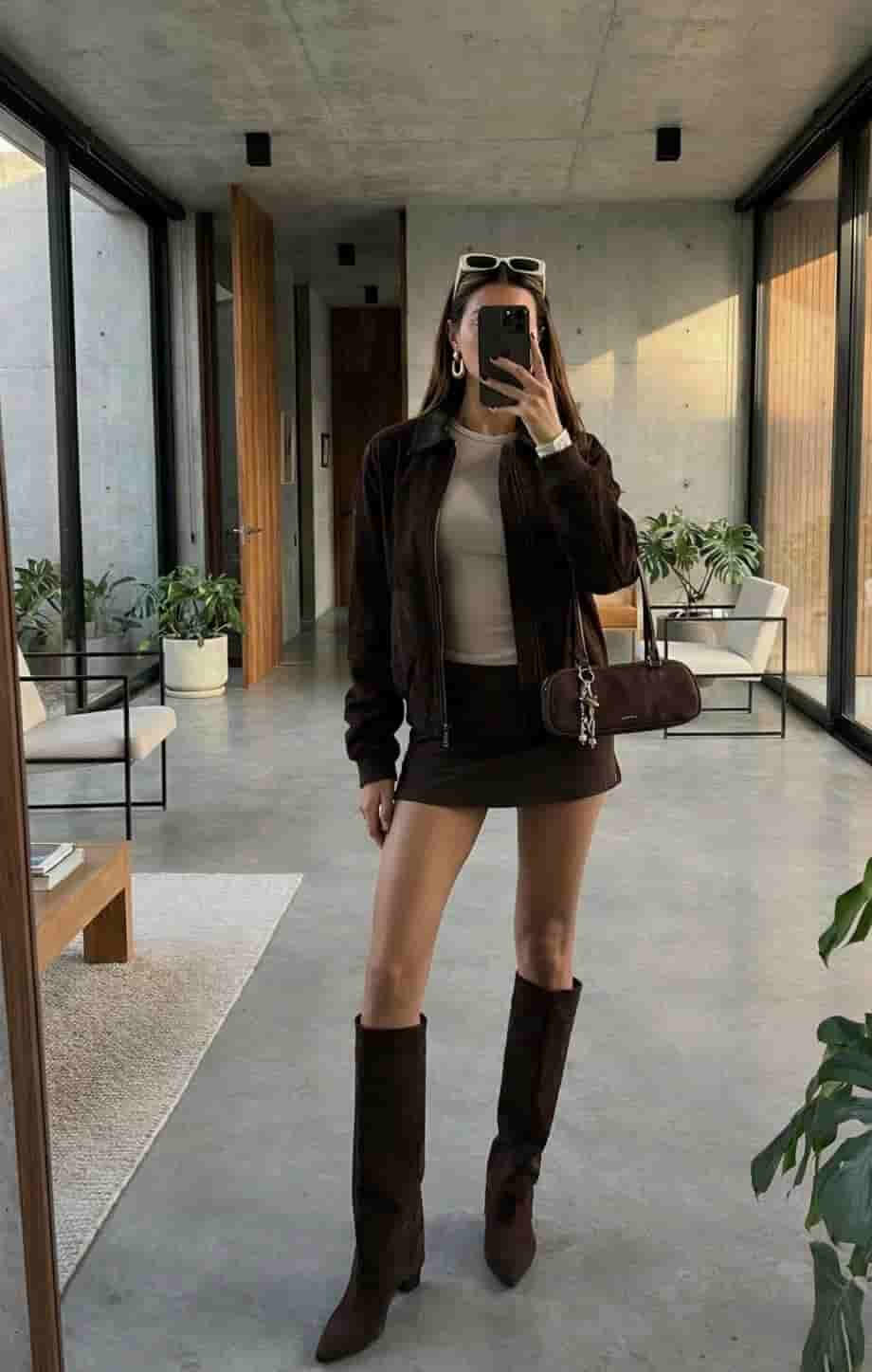 Chic neutral outfit: off-shoulder top paired with a brown leather pleated mini skirt, styled with knee-high boots, a tailored blazer, and a bag 🤎✨