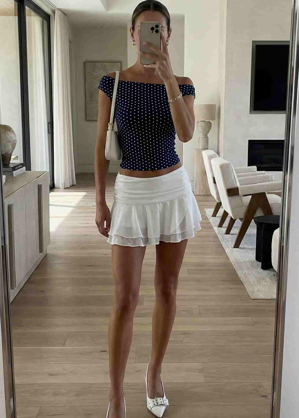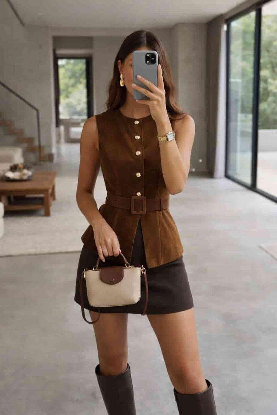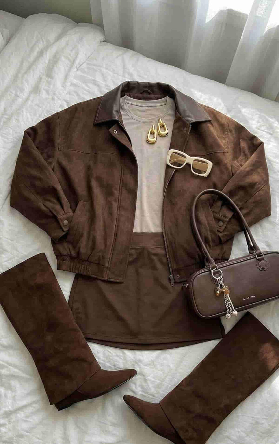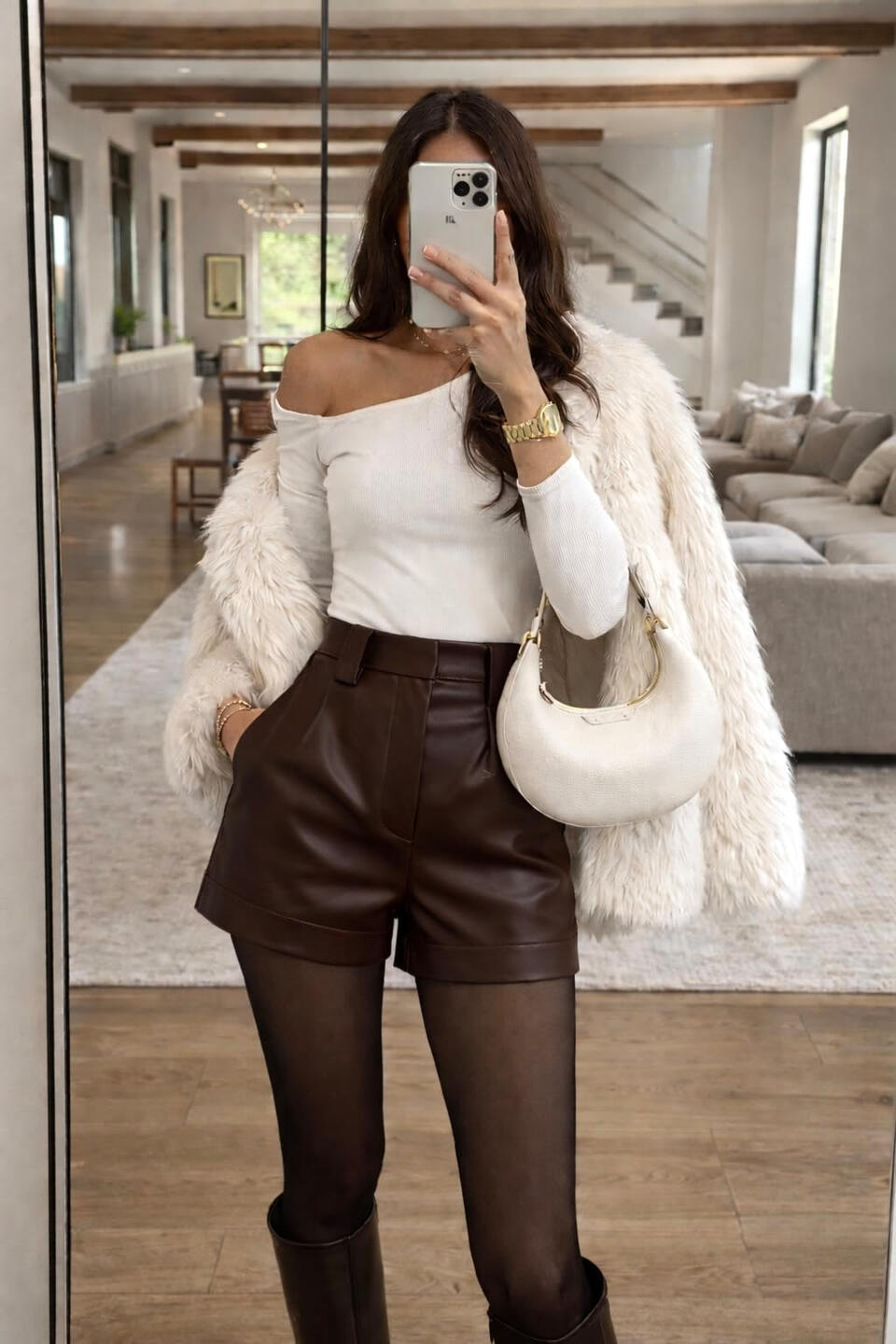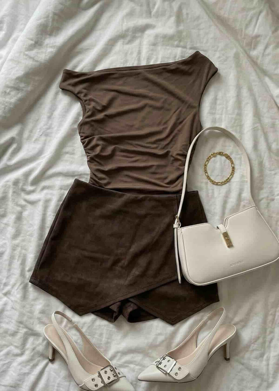 Chic neutral outfit: off-shoulder top paired with a brown leather pleated mini skirt, styled with knee-high boots, a tailored blazer, and a bag 🤎✨