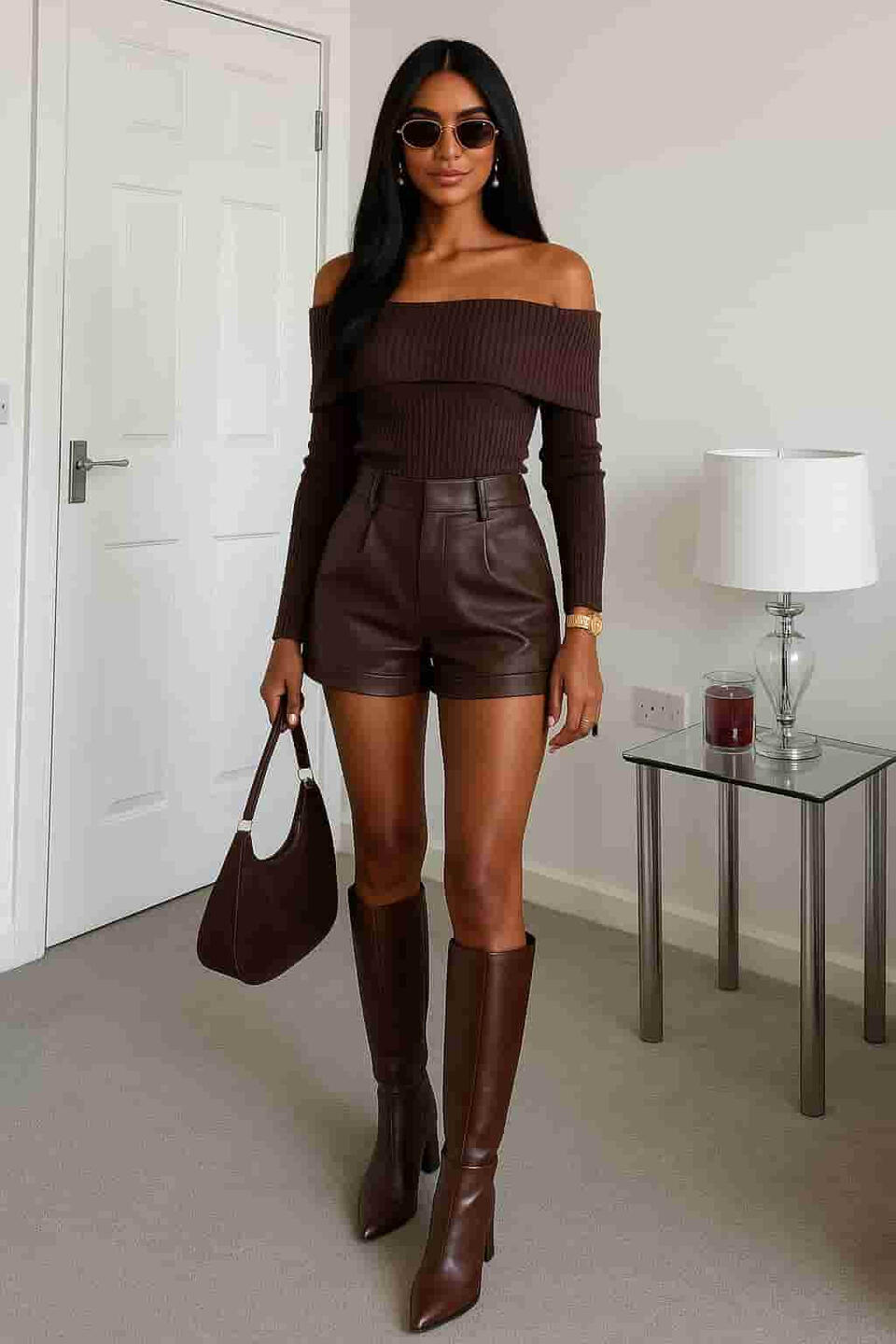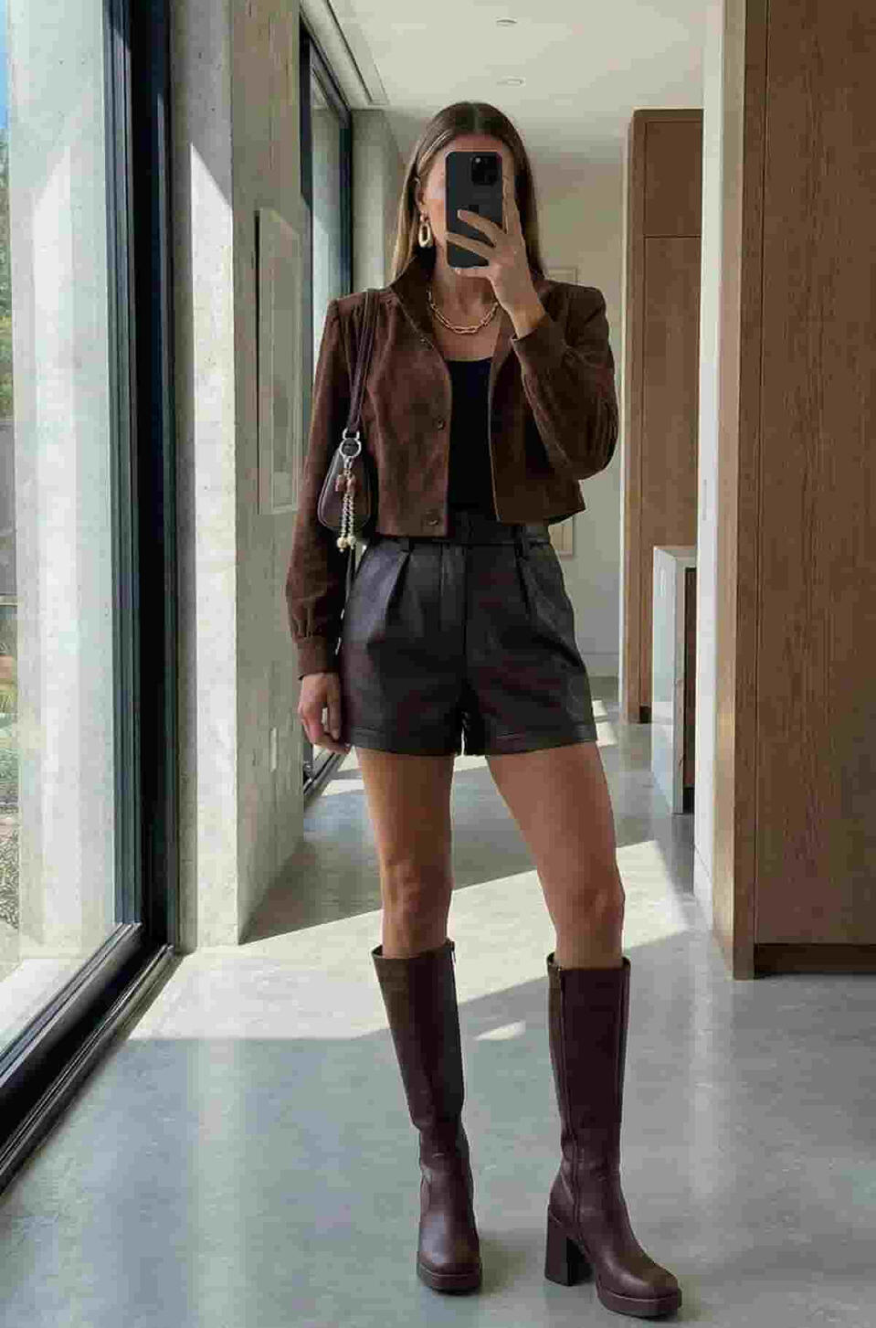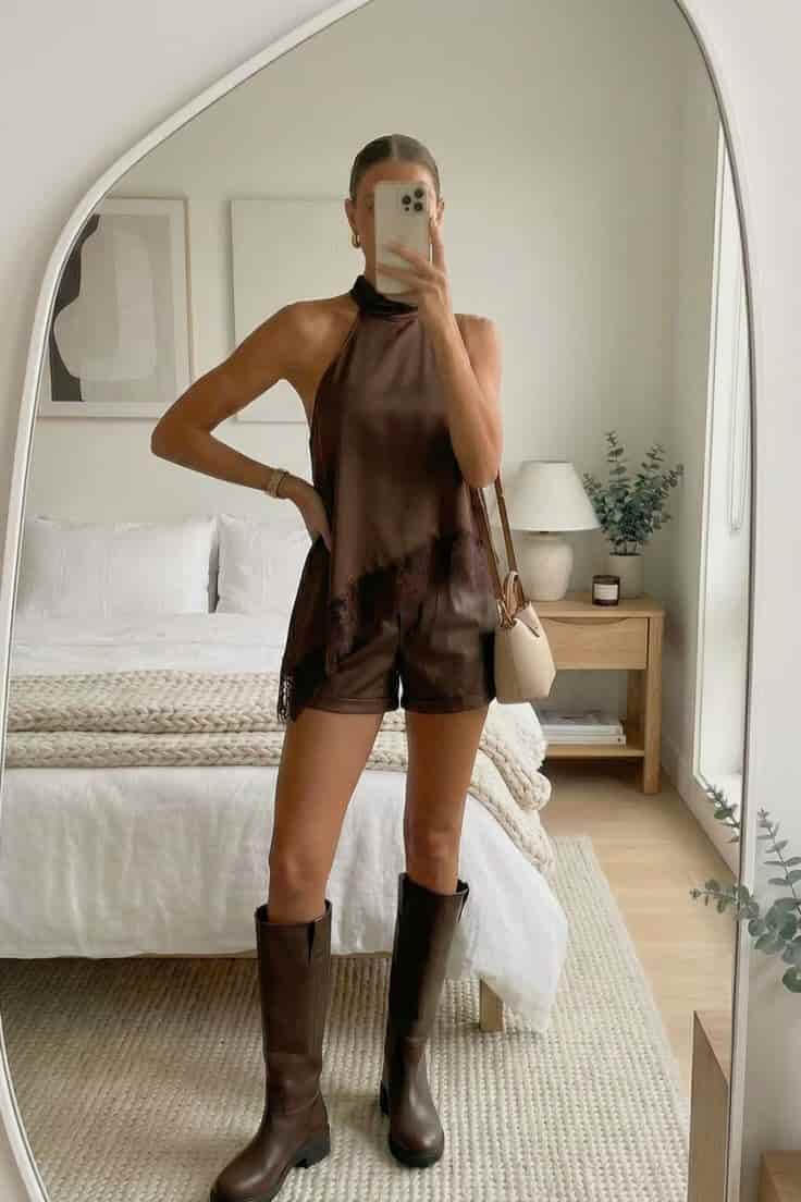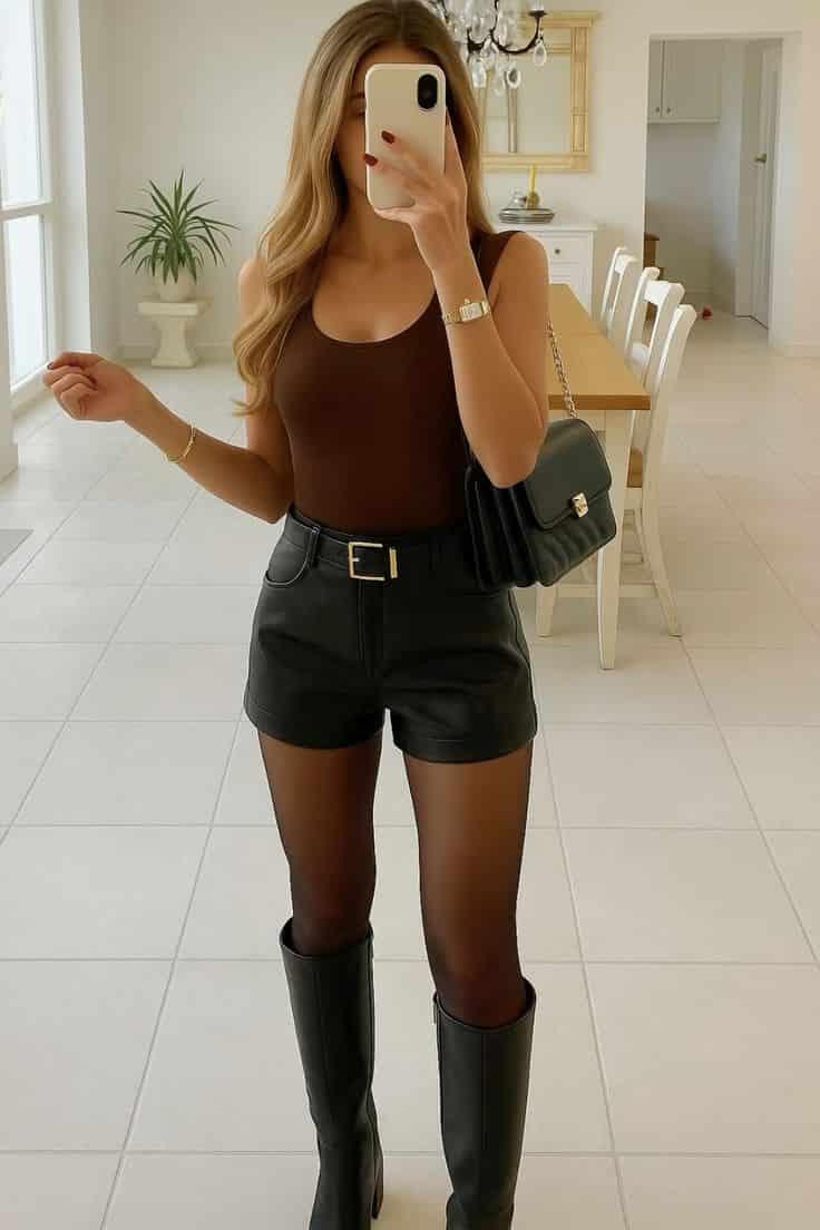 Chic fall outfit: brown knit sweater, leather shorts & black knee-high boots ✨